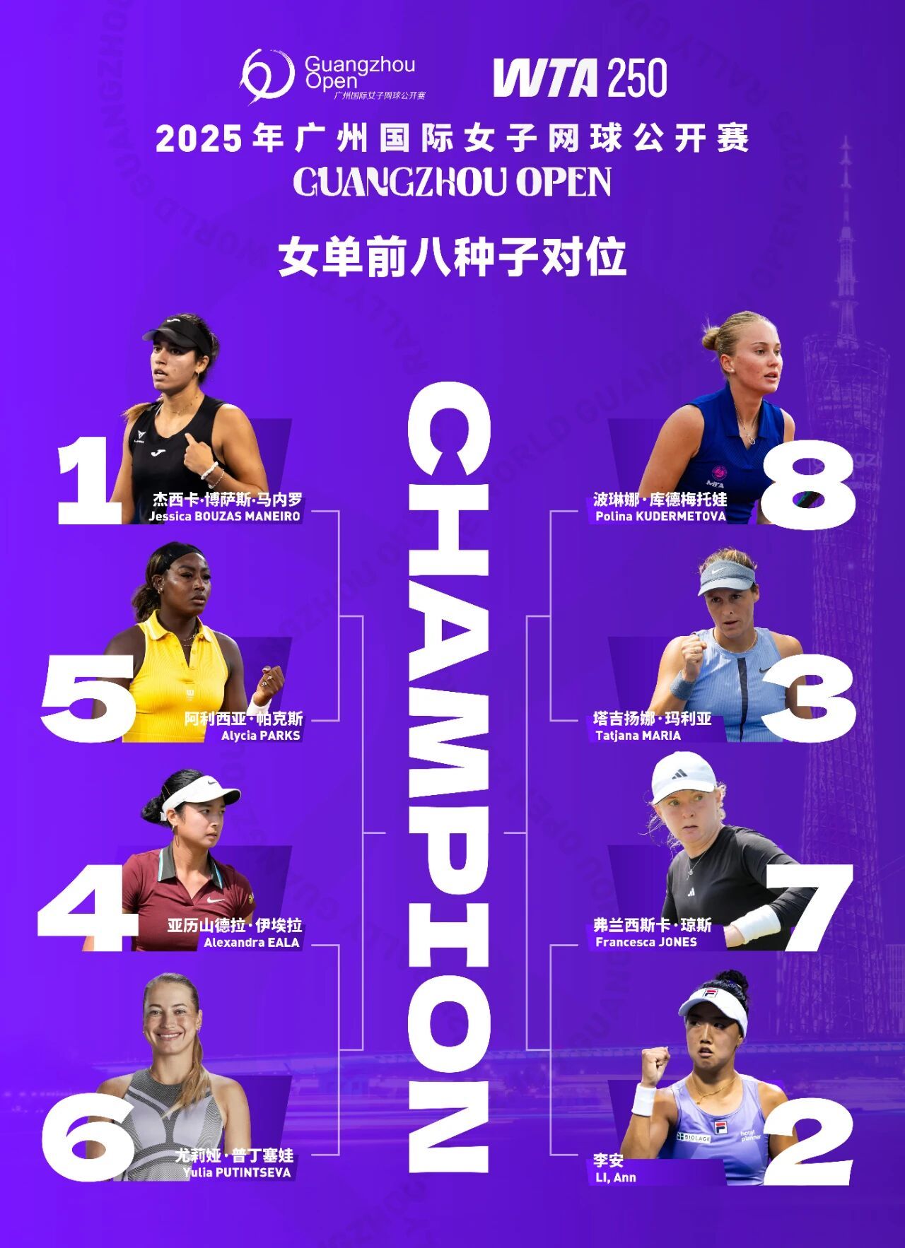 10月19日一点金,2025年广州国际女子网球公开赛女子单打签表出炉,张帅领衔王曦雨、王雅繁和郭涵煜等中国选手出战,玛利亚、普汀塞娃、伊埃拉、汤姆贾诺维奇和帕克斯等名将参赛。10月20日,单双打正赛在广州南沙国际网球中心开幕。